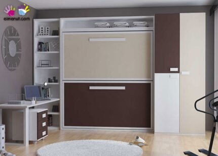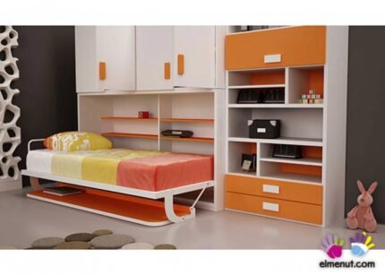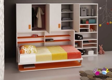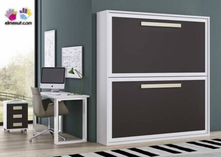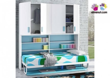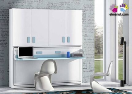 Horizontal folding bunk bed measuring 90 x 190 with wardrobe and study area