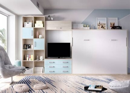 Living room with wardrobe, bookcase and folding bed of 135×190