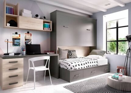 Youth bedroom with vertical folding bed, study area and wardrobe
